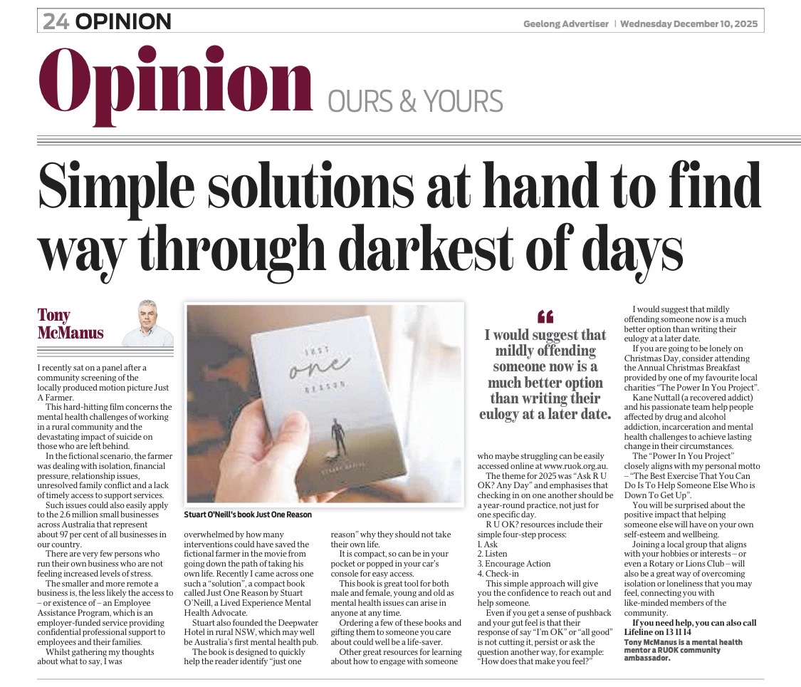 Many thanks to Keith Fagg OAM for the opportunity to share some thoughts in the Geelong Advertiser to help members of our community who may be struggling in this lead up to the Festive Season. There are many on the ground solutions that complement the well known services like R U OK? & Lifeline Australia. A few that are highlighted below include the inspirational Western District Farmer Leila Sweeney-McDougall via her feature film Just a Farmer, Stuart O’Neill founder of a Mental Health Pub in Outback New South Wales who wrote a brilliant hashtagSuicidePrevention tool the book “Just One Reason”. Finally the awesome work of Kane Nuttall & his team at the The Power In You Project help people affected by drug & Alcohol addiction, homelessness, incarceration & mental health challenges.